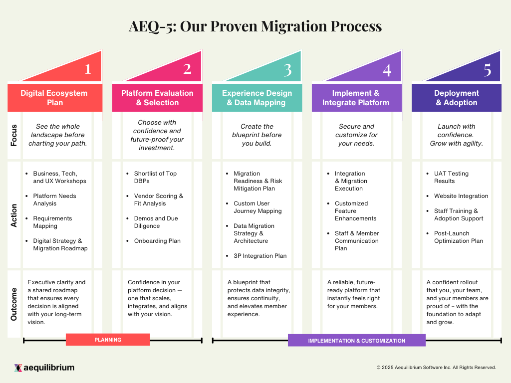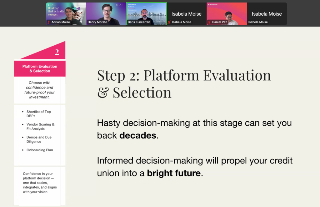 During our recent webinar, moderated by Henry Morato, Growth and Partnerships — AEQ’s leadership team introduced credit union leaders to our 5-Step Proven Process for Digital Banking Migration. This framework is designed to bring clarity, confidence, and alignment to one of the most critical choices any CU can make.